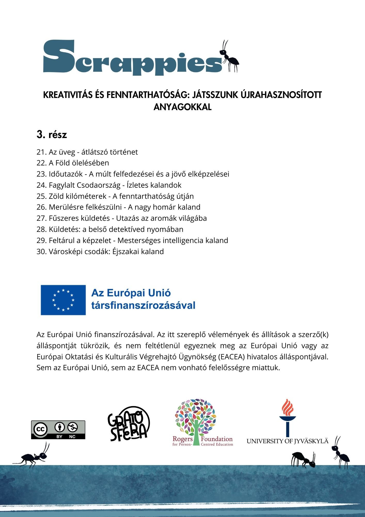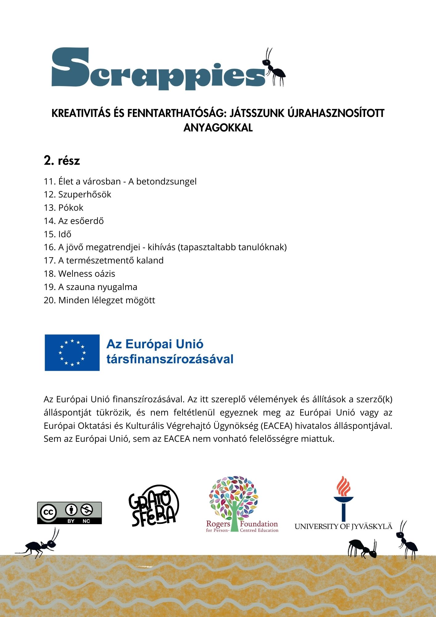 A Scrappies kézikönyv elméleti bevezetést nyújt a kreativitás fejlesztéséhez és az újrahasznosított anyagok iskolai alkalmazásához. A kézikönyv nemzetközi jó gyakorlatokat mutat be, valamint részletesen összehasonlítja a finn, lengyel és magyar oktatási rendszerek fenntarthatósághoz kapcsolódó megközelítéseit. A kiadvány ajánlásokat is tartalmaz döntéshozók, intézményvezetők és szakpolitikai szereplők számára a fenntarthatóság beépítéséről az oktatásba.